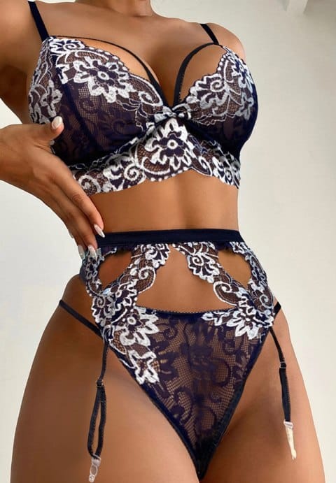 Embroidered Underwired Mesh 3 Piece Lingerie Set